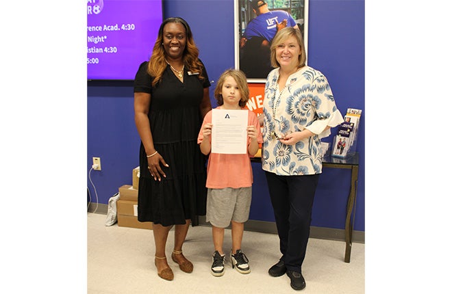 Congratulations to Northeast Academy for Aerospace and Advanced Technologies student Theodore Noble! He is the winner of Albemarle EMC's contest to attend the Carolina Men's Basketball School camp at UNC Chapel Hill. He is accompanied by Assistant Principal Shayla Spence (left) and Principal Dr. Leah Lane.
