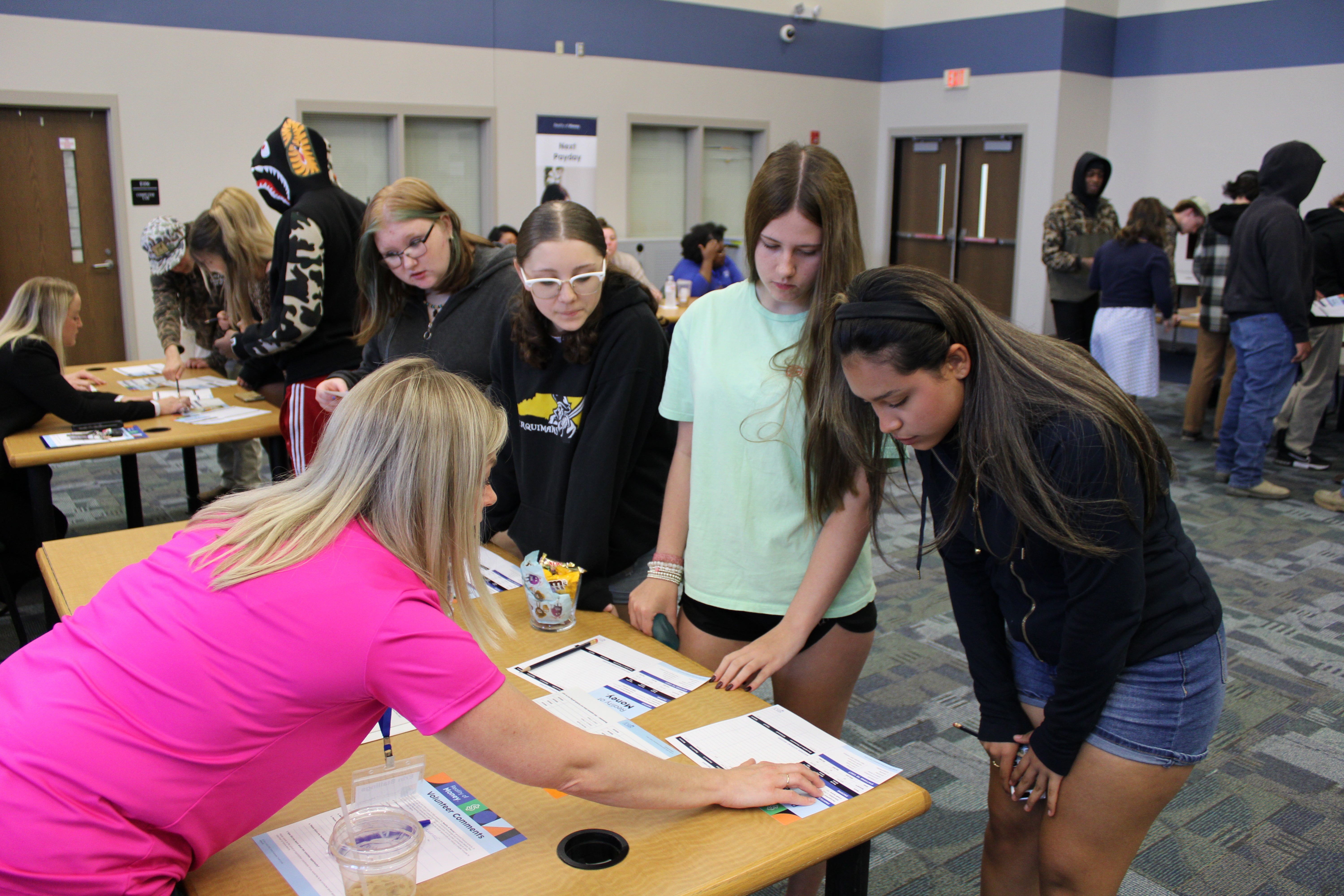 Erin Stallings, Albemarle EMC's manager of corporate services, explains grocery-shopping budget options to Perquimans County High School students. Sponsored by the State Employees Credit Union, the Reality of Money event enabled students to make simulated real world budget decisions that included expenses for childcare, transportation, housing, groceries and several other categories. Students were randomly assigned statuses such as married, single, children or no children, making their ability to stay within the limits of their income easier or harder.